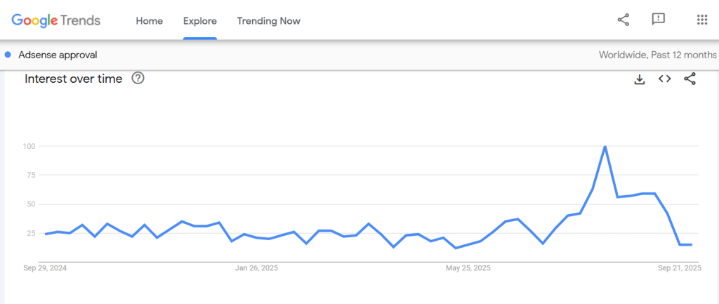 Before you beat yourself up on an AdSense rejection, let us tell you a not-so-secret secret. Google Trends shows that searches for “AdSense approval” have been all over the place in 2024–2025. That tells us more and more bloggers are struggling with the same issue, which means you’re not alone.